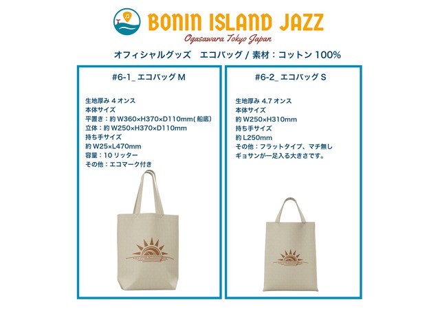 買って応援! BONIN ISLAND JAZZ -シマノオト- #6-2 エコバッグS 予約販売開始 公募で選ばれた公式Tシャツのフロントワンポイントデザインをあしらったコットンバッグ。 日常使いはもちろん、ギフトバッグとしてのご使用にもおすすめです。 「ぎょさん」が一足入るサイズです。 ・素材 コットン100% ・生地厚み 4.7オンス ・本体サイズ 約W250xH310mm ・持ち手サイズ 約L250mm 説明・用途等 A4サイズのフラット(マチなし)なバッグです。薄手で軽いのでお買い物用のエコバッグやサブバッグとしてもご利用いただけます。 ◾️デザイナー みさき(小笠原高校) ◾️作者より 島の音楽はのどかで、自由で、とても豊かです。そんな音楽の集まりとも言えるBONIN ISLAND JAZZ のデザインに選んでいただきとても嬉しく思っています。島の音や風を感じながら、Tシャツも楽しんでいただけたら嬉しいです。 ................................. イベント会場販売では売り切れる場合もありますので、ご予約での注文をお勧めします。 <予約販売品の発送と送料、お受け取りについて> ◾️2025年10月31日までのご予約分の発送は11月29日から順次お送りいたします。 ◾️BONIN ISLAND JAZZ 野外イベント会場でお受け取りの場合は送料無料。配送方法は「イベント会場で受け取り」をご選択ください。 ※会場受取日時場所:2025年11月29日 10:30-18:00小笠原村父島おまつり広場本部テントにて ※荒天時は翌日に順延。 ※天候状況等により開催中止となった場合はご登録のご住所へ発送、または後日父島島内で手渡しのいずれかとなります。