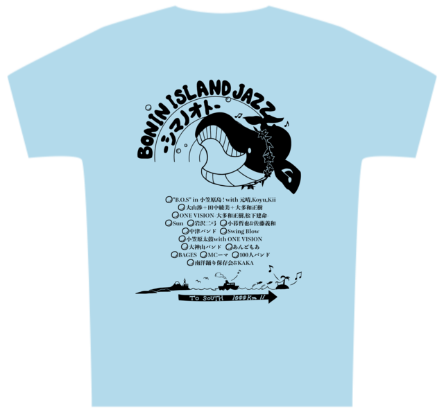 #0-9_物品協賛1口 ・1口以上の物品返礼協賛品として差し上げております。 ・ BONIN ISLAND JAZZ -シマノオト- ホームページ「Supporters」欄にテキストでお申込者様のお名前を掲載させていただきます。お申込者名と異なるお名前を掲載されたい場合や 匿名希望の場合はコメント欄に明記ください。(掲載名は15文字以内) リミテッドエディションTシャツ #8 ライトブルー(5.6オンス) ※受注予約販売のみ 公募の中で特に人気の高かった作品を、特別企画Tシャツとして数量限定でお届けします! ◾️デザイナー 千住 マサト ◾️作者より 自分自身の小笠原へのイメージと、いつか絶対行きたい場所であるという憧れ、そして何より今回のイベントを微力ながらに盛り上げたい一心で描きました。自分の絵がその一助になりましたら大変光栄です! ◾️作成したデザインについて フロントのワンポイント 両側のテナーサックス・ウクレレはミュージシャン、真ん中の帽子とマイクはスタッフをイメージして描いています。このデザインのシャツをお客さんが着るとイベントを作り上げる3者がそろう、という思惑があります。(もちろんマイクはボーカルの意味も込めています。) バックのデザイン レイをかけたザトウクジラを、小笠原のイメージとして採用。そのクジラが出す音=シマノオトとして、海の中・空間に広がるようにタイトルを描きました。 東京から出港し、1000キロの海の旅を経ること。今回のイベント開催で、ワクワクと楽しい気持ちが島に集まっていく様を絵にしました。 ................................. いつか絶対行きたい!という小笠原への憧れと楽しさ集まるイメージ、イベントに対する思いを、手書きならではの優しいデザインで表現されている一枚です! ※こちらのデザインは限定品のため、受注予約販売のみとなります。 <予約販売品の発送と送料、お受け取りについて> ◾️2025年10月31日までのご予約分の発送は11月29日から順次お送りいたします。 ◾️BONIN ISLAND JAZZ 野外イベント会場でお受け取りの場合は送料無料。配送方法は「イベント会場で受け取り」をご選択ください。 ※会場受取日時場所:2025年11月29日 10:30-18:00小笠原村父島おまつり広場本部テントにて ※荒天時は翌日に順延。 ※天候状況等により開催中止となった場合はご登録のご住所へ発送、または後日父島島内で手渡しのいずれかとなります。 ◾️2025年11月1日以降12月8日18:00までのご予約品について 2026年1月中旬以降から順次お送りいたします。 ◾️12月8日18:00以降2026年1月10日までのご予約について(最終) 2026年1月10日以降の制作、お届けは2月中旬以降となります。 ※小笠原村父島 島内にてご連絡やり取りの上直接お受け取りご希望の方は送料無料。「小笠原村父島 島内限定受け渡し」をご選択ください。