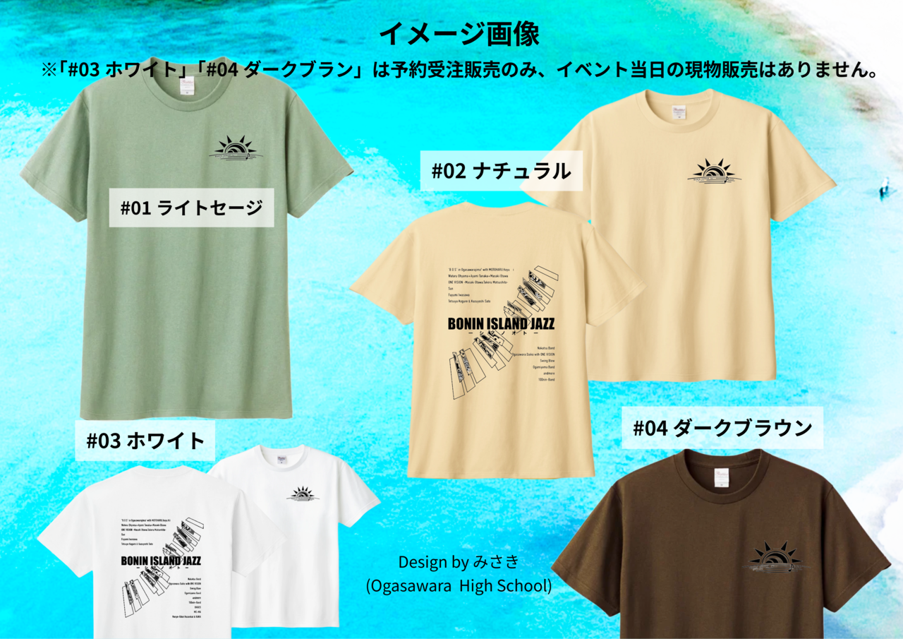 島の音楽はのどかで、自由で、とても豊かです。そんな音楽の集まりとも言えるBONIN ISLAND JAZZ のデザインに選んでいただきとても嬉しく思っています。島の音や風を感じながら、Tシャツも楽しんでいただけたら嬉しいです。